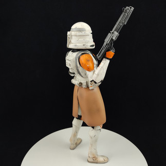 Escultura de 32 centímetros de altura, figura con pose listo para el combate, sujetando su bláster DC-15S y granada, pintura personalizada dando realismo a relieves y sombras, base personalizada recreando pasillo de su nave estelar, también nombre del personaje utilizando fuente de Star Wars y el emblema de la república galáctica durante las guerras clónicas, hecho en el mismo material de la escultura, PLA para impresoras 3D.