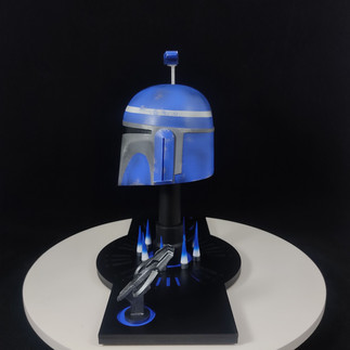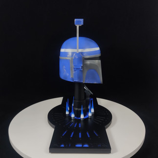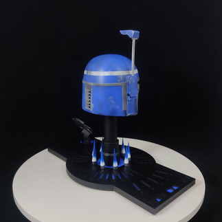 Casco de 10 centímetros de altura, con el rangefinder llegando a 13 centímetros de altura, pintura personalizada dando realismo a relieves y sombras, base personalizada con el nombre del personaje en lenguaje aurebesh, hornillas con fuego recreando horno mandaloriano de la armera y símbolo mitosaurio, hecho en el mismo material de la escultura, PLA para impresoras 3D.