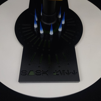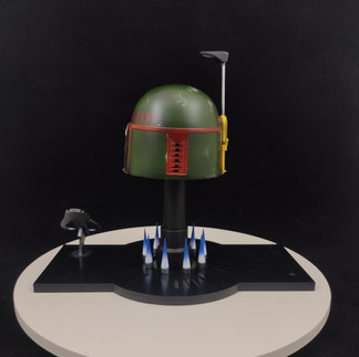 Casco de 10 centímetros de altura, con el rangefinder llegando a 14 centímetros de altura, pintura personalizada dando realismo a relieves y sombras, base personalizada con el nombre del personaje en lenguaje aurebesh, hornillas con fuego recreando horno mandaloriano de la armera y símbolo mitosaurio, hecho en el mismo material de la escultura, PLA para impresoras 3D.