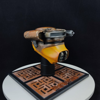 Casco de 12 centímetros de altura, pintura personalizada dando realismo a relieves y sombras, base personalizada recreando planeta Tatooine, arena, también nombre del personaje usando la fuente de Star Wars, hecho en el mismo material empleado en la escultura, PLA para impresoras 3D.