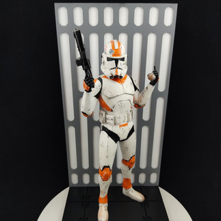 Escultura de 32 centímetros de altura, figura con pose listo para el combate, sujetando su bláster DC-15S y thermal detonator, pintura personalizada dando realismo a relieves y sombras, base personalizada recreando pasillo de su nave estelar, también nombre del personaje utilizando fuente de Star Wars y el emblema de la república galáctica durante las guerras clónicas, hecho en el mismo material de la escultura, PLA para impresoras 3D.