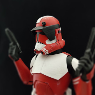 Escultura de 32 centímetros de altura, figura con pose listo para el combate, sujetando sus dos armas DC-17, pintura personalizada dando realismo a relieves y sombras, base personalizada recreando pasillo de su nave estelar, también nombre del personaje utilizando fuente de Star Wars y el emblema de la república galáctica durante las guerras clónicas, hecho en el mismo material de la escultura, PLA para impresoras 3D.