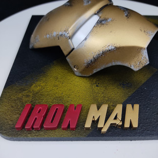 Máscara rostro de Iron Man de altura de 10 centímetros, pintura personalizada dando realismo a relieves y sombras, (daño por batalla), base personalizada en ambiente urbano, también nombre del personaje utilizando fuente Avenger, hecho en el mismo material empleado en la escultura, PLA para impresoras 3D.