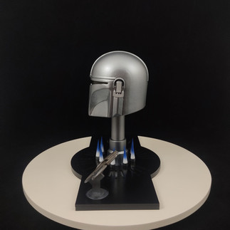 Casco de 10 centímetros de altura, pintura personalizada dando realismo a relieves y sombras, base personalizada con el nombre del personaje en lenguaje aurebesh, hornillas con fuego recreando horno mandaloriano de la armera y símbolo mitosaurio, hecho en el mismo material de la escultura, PLA para impresoras 3D.