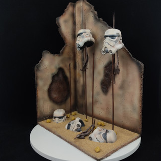 Dos casco de 6 centímetros de altura y tres cascos enterrados en la arena, pintura personalizada dando realismo a relieves y sombras, diorama personalizado recreando el planeta Tatooine.
