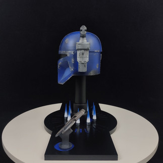 Casco de 11 centímetros de altura, pintura personalizada dando realismo a relieves y sombras, base personalizada con el nombre del personaje en lenguaje aurebesh, hornillas con fuego recreando horno mandaloriano de la armera y símbolo mitosaurio, hecho en el mismo material de la escultura, PLA para impresoras 3D.