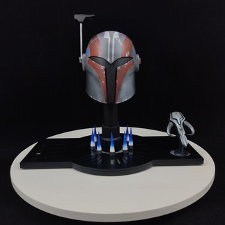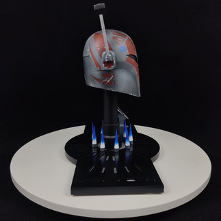 Casco de 10 centímetros de altura, con el rangefinder llegando a 12.6 centímetros de altura, pintura personalizada dando realismo a relieves y sombras, base personalizada con el nombre del personaje en lenguaje aurebesh, hornillas con fuego recreando horno mandaloriano de la armera y símbolo mitosaurio, hecho en el mismo material de la escultura, PLA para impresoras 3D.