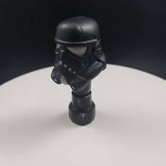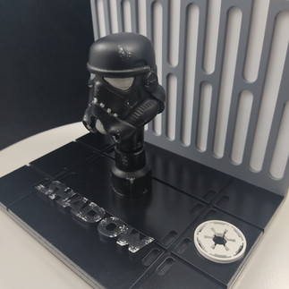 Casco de 6 centímetros de altura, pintura personalizada dando realismo a relieves y sombras, base personalizada recreando pasillo de la estación de la muerte (Death Star), nombre del trooper utilizando fuente de Star Wars, también logo imperial, hecho en el mismo material de la escultura, PLA para impresoras 3D.