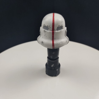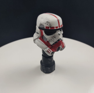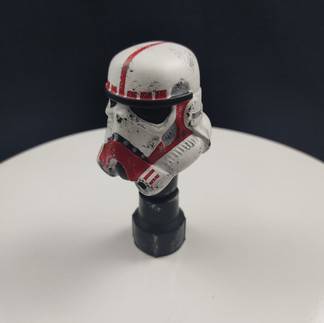 Casco de 6 centímetros de altura, pintura personalizada dando realismo a relieves y sombras, base personalizada recreando pasillo de la estación de la muerte (Death Star), nombre del trooper utilizando fuente de Star Wars, también logo imperial, hecho en el mismo material de la escultura, PLA para impresoras 3D.