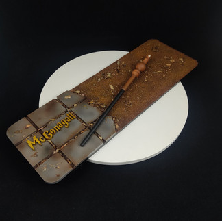 Varita mágica de Minerva McGonadall, varita de longitud de 27 centímetros, pintura personalizada dando realismo a relieves y sombras, base personalizada, también nombre del personaje utilizando fuente de Harry Potter, hecho en el mismo material empleado en la varita, PLA para impresoras 3D.